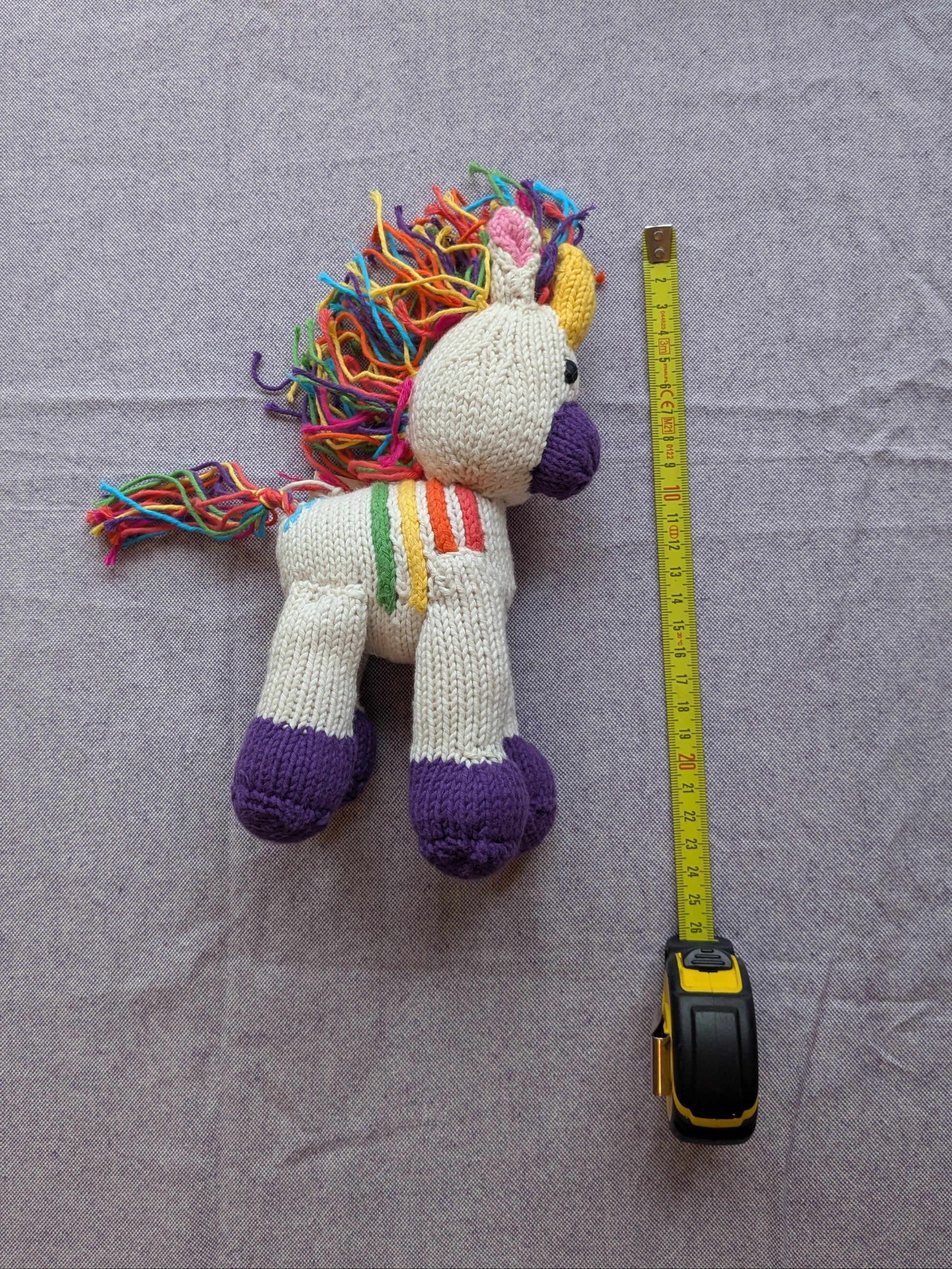 Deze vrolijke, handgebreide knuffel is met veel zorg gemaakt van ecokatoen. Met een lengte van 23cm is hij perfect om mee te knuffelen, maar ook heel geschikt als decoratie in een baby- of kinderkamer.