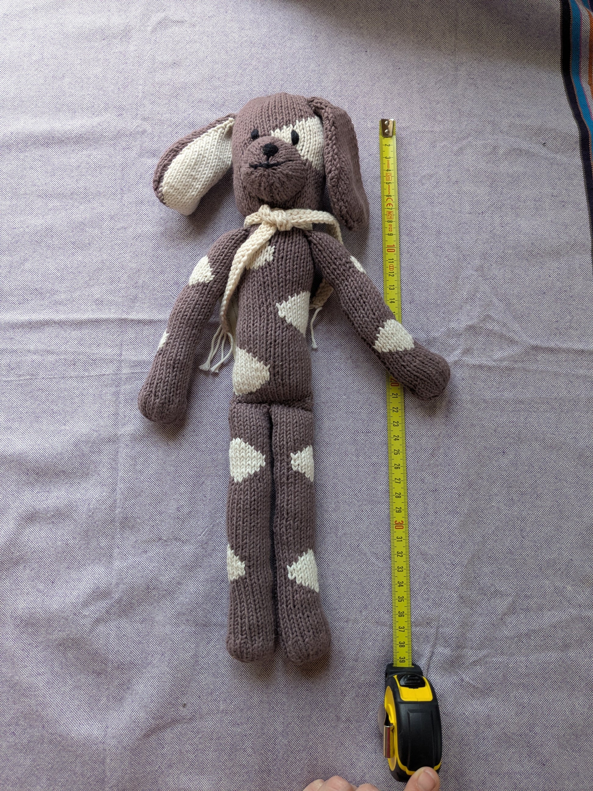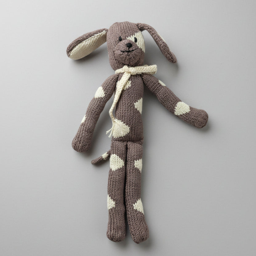 Deze vrolijke, handgebreide knuffel is met veel zorg gemaakt van ecokatoen. Met een lengte van 38 cm is hij perfect om mee te knuffelen, maar ook heel geschikt als decoratie in een baby- of kinderkamer.